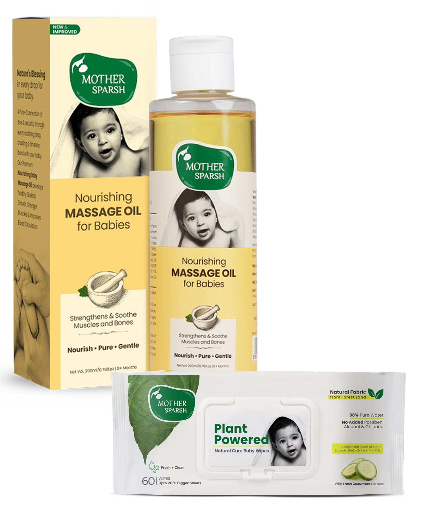 Mother Sparsh Baby Nourishing Baby Massage Oil - 200 ml & Mother Sparsh Baby Plant Powered Natural Baby Wipes With Cucumber Extract - 60 Pieces