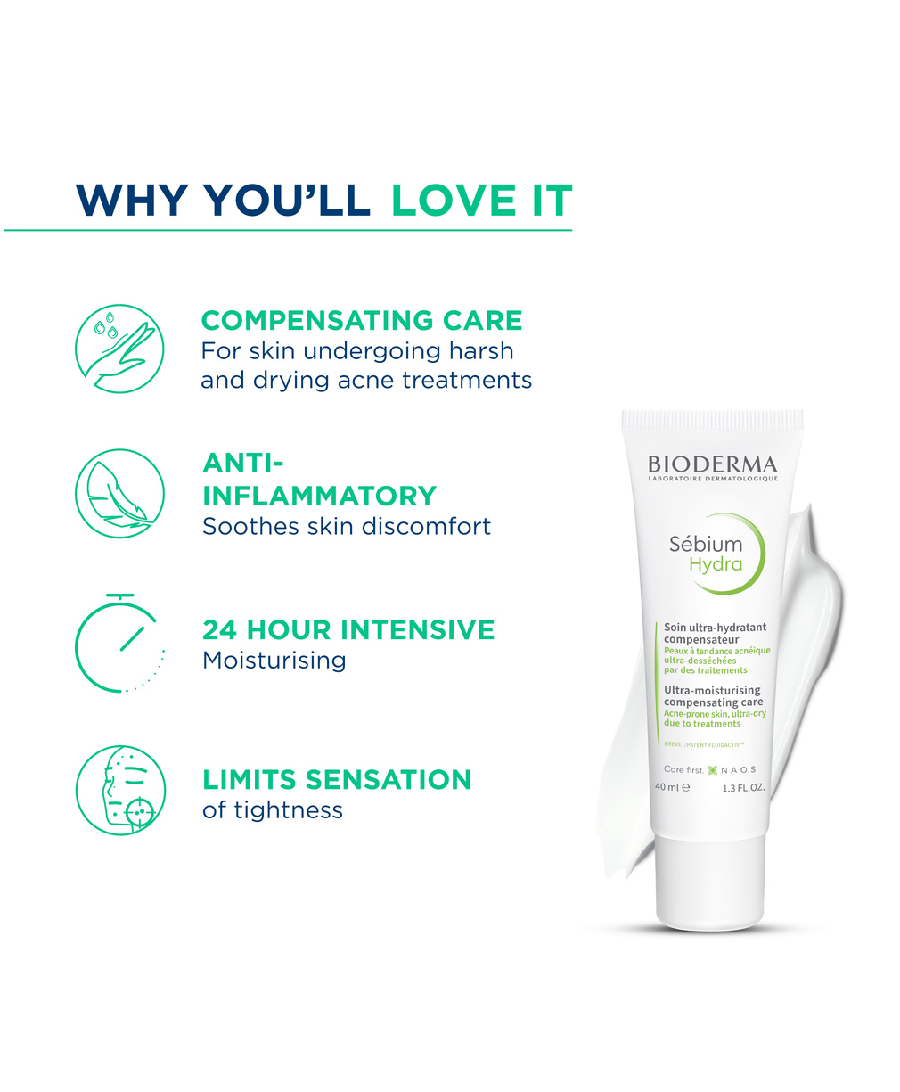 Bioderma Moisturizer Sebium Hydra for Oily Acne-Prone Skin with Ceramides for 24H Hydration - 40ml