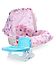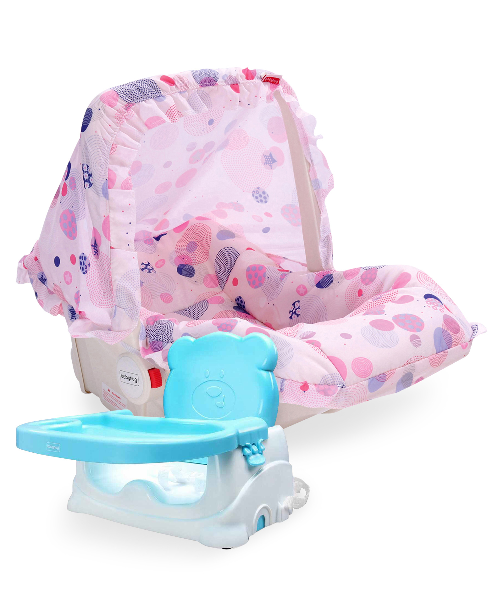 Babyhug Spring 5 in 1 Carry Cot Cum Rocker With Mosquito Net - Pink AND Babyhug Raise Me Up Baby Booster Seat With Adjustable Food Tray & 3 Point Safety Harness - Sky Blue White
